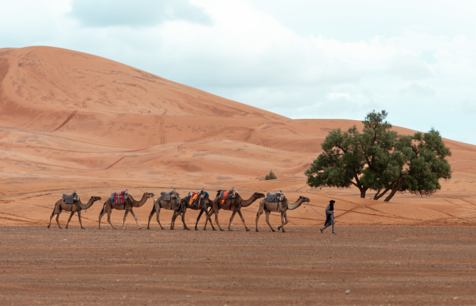 Explore the breathtaking desert landscapes on a 4-day trip from Marrakech to Erg Chigaga and explore the stunning desert. Travel across the Atlas Mountains and the highest pass in North Africa, passing old villages, green oases, and ancient trade routes. Visit Berber villages and Morocco’s famous carpet-making town. Our experienced drivers will take you through different desert landscapes to a desert camp. Ride camels on the sand dunes, try sandboarding, and watch beautiful sunsets from the highest dune. Meet local nomads, enjoy drum music, and sleep in a traditional tent under the stars.